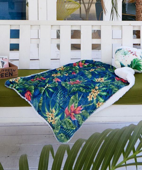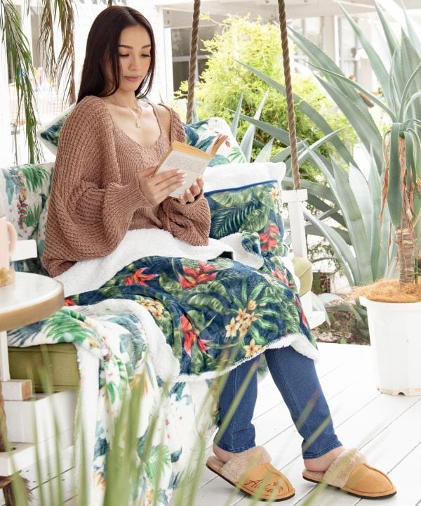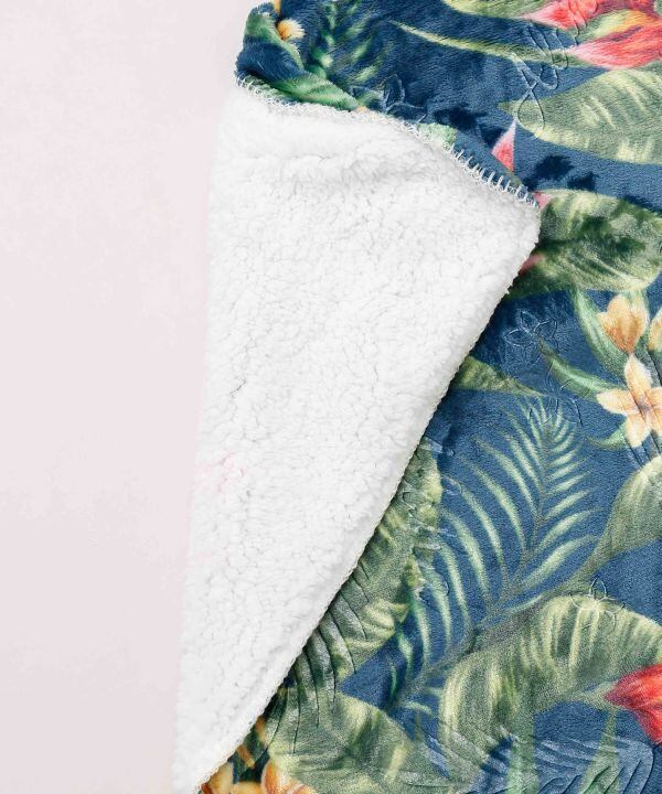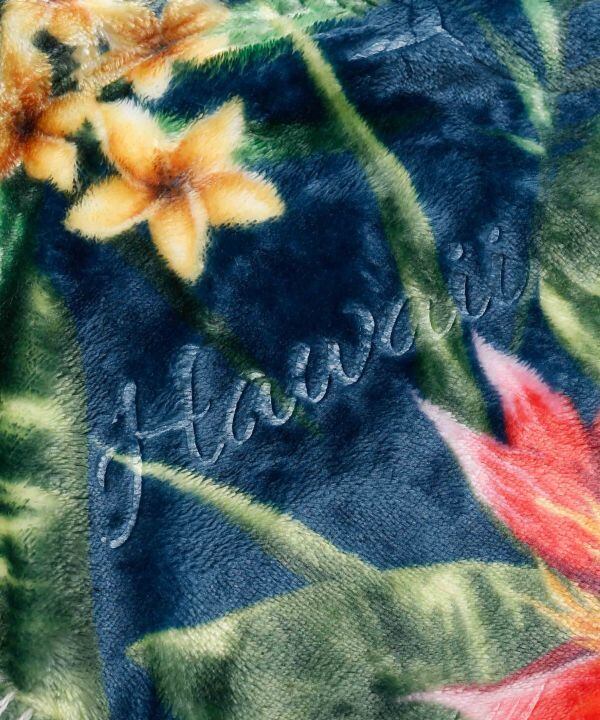 ハワイアンボタニカル柄に、型押しでAlohaロゴやパームリーフ柄が押されている上品な雰囲気のブランケット。Sサイズはひざ掛けとして、赤ちゃんの肌掛けとしてちょうど良いサイズ。パッカブル仕様になっています。鮮やかなボタニカル柄は日々のライフスタイルを素敵に演出してくれます。