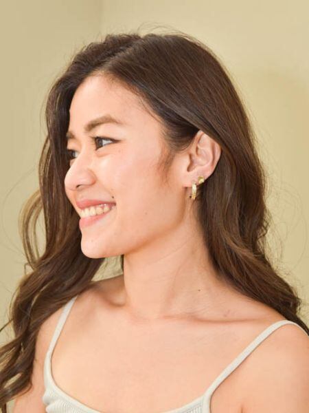 ハイビスカス(アロアロ)とハワイアンジュエリー調フープのセットピアス。立体的なハイビスカスは可憐な印象。ハワイアンジュエリー調の紋様をほどこしたフープピアスはシンプルなのでどんなコーディネートにも合います。