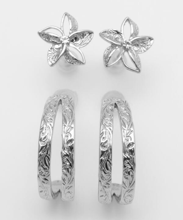 HAWAIIで愛されてやまないプルメリアと2連のフープを組み合わせたセットピアス。さまざまな組合わせで毎日のコーデをお楽しみいただけます。
